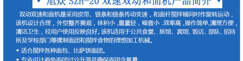 SZH-20型雙速雙動(dòng)和面機(jī),本機(jī)適合攪拌各種面包、包子、饅頭、湯圓、披薩餅面團(tuán),專業(yè)設(shè)計(jì)避免面團(tuán)過分升溫并確保面團(tuán)含氧量。過載、缺相保護(hù)裝置,防護(hù)罩安全連動(dòng)裝置。