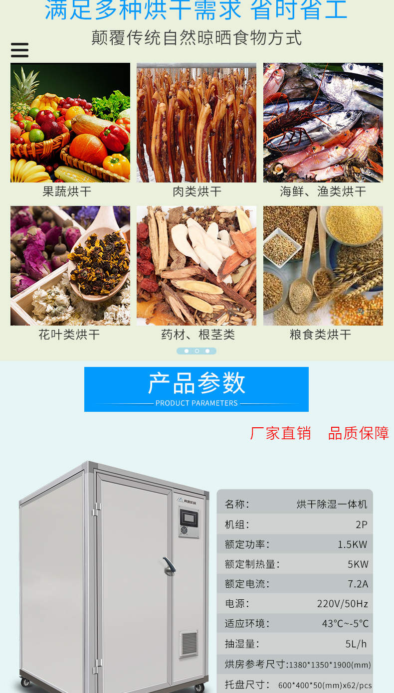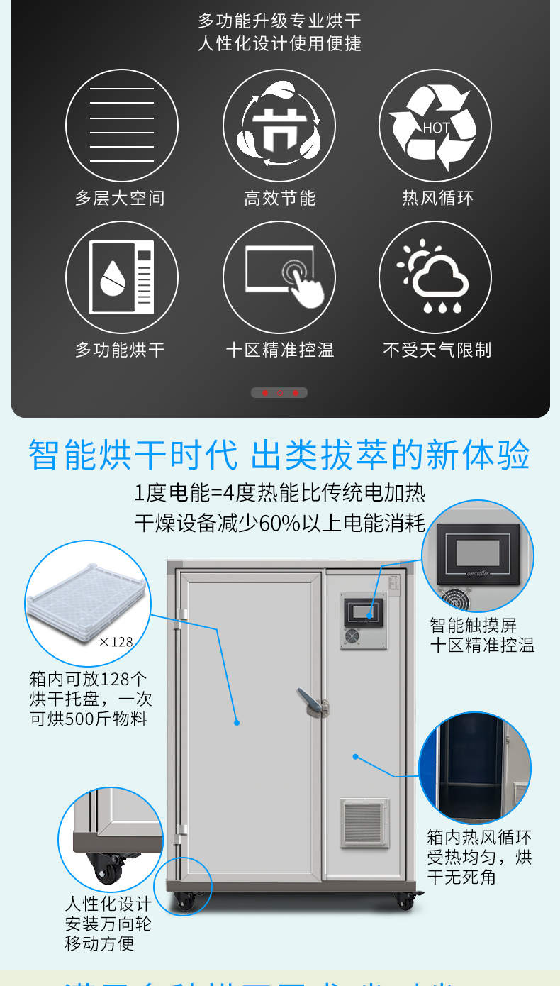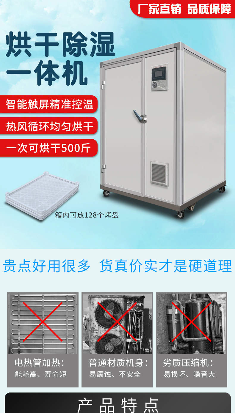 烘干除濕一體機(jī),烘干除濕體機(jī),智能觸屏精準(zhǔn)控溫?zé)犸L(fēng)循環(huán)均勻烘干次可烘干500斤,智能烘干時(shí)代出類拔萃的新體驗(yàn),1度電能=4度,熱能比傳統(tǒng)電加熱。干燥設(shè)備減少60%以上電能消耗。