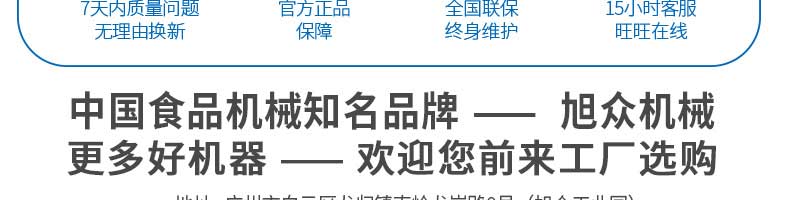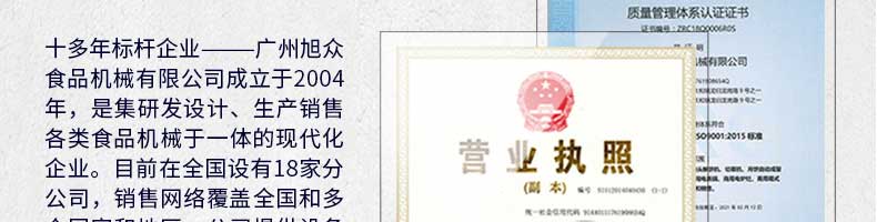 廣州旭眾食品機(jī)械有限公司是一家集科研開發(fā),生產(chǎn)設(shè)計(jì),營銷服務(wù)為一體的現(xiàn)代化生產(chǎn)企業(yè)?,F(xiàn)代化生產(chǎn)車間,精湛制造技術(shù),所產(chǎn)機(jī)械歷經(jīng)市場(chǎng)重重考驗(yàn),不斷贏得海內(nèi)外客戶的贊譽(yù)。