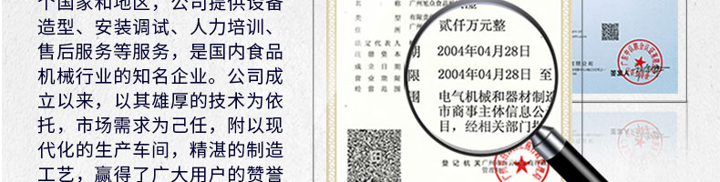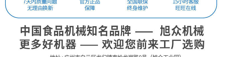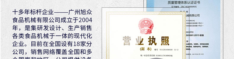 廣州旭眾食品機械有限公司是一家集科研開發(fā),生產(chǎn)設計,營銷服務為一體的現(xiàn)代化生產(chǎn)企業(yè)?,F(xiàn)代化生產(chǎn)車間,精湛制造技術(shù),所產(chǎn)機械歷經(jīng)市場重重考驗,不斷贏得海內(nèi)外客戶的贊譽。