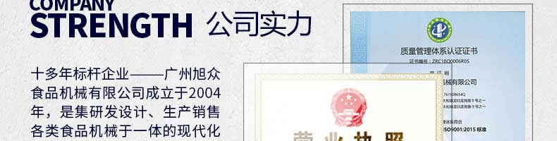 廣州旭眾食品機(jī)械有限公司是一家集科研開發(fā),生產(chǎn)設(shè)計(jì),營(yíng)銷服務(wù)為一體的現(xiàn)代化生產(chǎn)企業(yè)?,F(xiàn)代化生產(chǎn)車間,精湛制造技術(shù),所產(chǎn)機(jī)械歷經(jīng)市場(chǎng)重重考驗(yàn),不斷贏得海內(nèi)外客戶的贊譽(yù)。