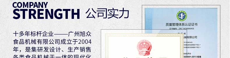 廣州旭眾食品機(jī)械有限公司是一家集科研開發(fā),生產(chǎn)設(shè)計(jì),營銷服務(wù)為一體的現(xiàn)代化生產(chǎn)企業(yè)。現(xiàn)代化生產(chǎn)車間,精湛制造技術(shù),所產(chǎn)機(jī)械歷經(jīng)市場重重考驗(yàn),不斷贏得海內(nèi)外客戶的贊譽(yù)。