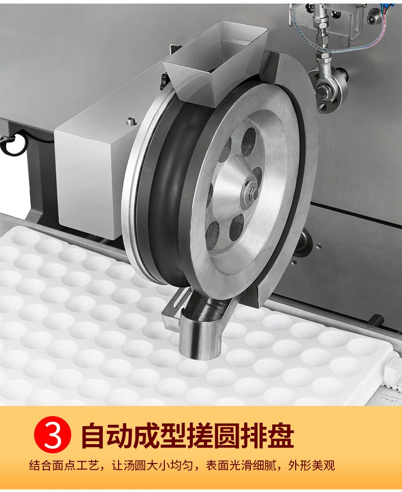 ◆觸摸屏自動控制搓圓擺盤一體成型技術(shù),使得制品外形美觀,大小均勻,表面光亮細膩、口感柔滑,彈韌性佳。