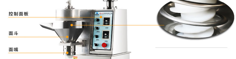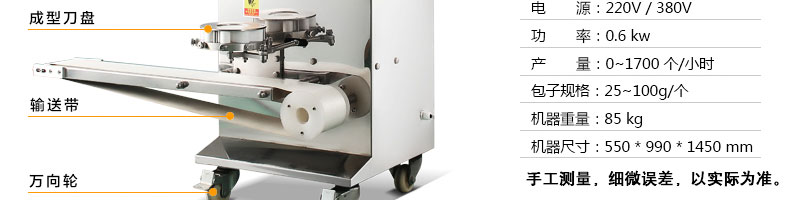名稱XZ-10型全自動包子機 電源220/380V(見機器名牌) 功率0.6kw 產(chǎn)量0-1700個/小時 尺寸550*900*1450mm(包括輸送帶) 重量85kg 規(guī)格25-100克/個 其他
