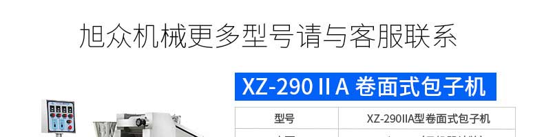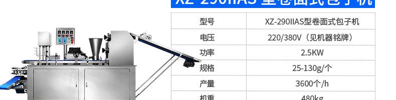 名稱XZ-290A智能卷式包子機 電源220/380v 功率3.3kw 產量0-36000個/h 尺寸2680*1500*1420mm 重量420kg 規(guī)格 其他