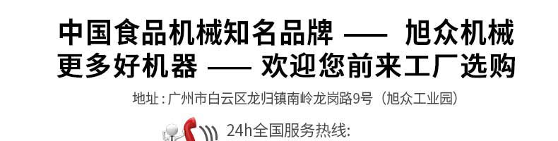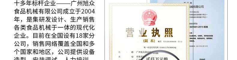 廣州旭眾食品機械有限公司是一家集科研開發(fā),生產(chǎn)設(shè)計,營銷服務(wù)為一體的現(xiàn)代化生產(chǎn)企業(yè)?,F(xiàn)代化生產(chǎn)車間,精湛制造技術(shù),所產(chǎn)機械歷經(jīng)市場重重考驗,不斷贏得海內(nèi)外客戶的贊譽。