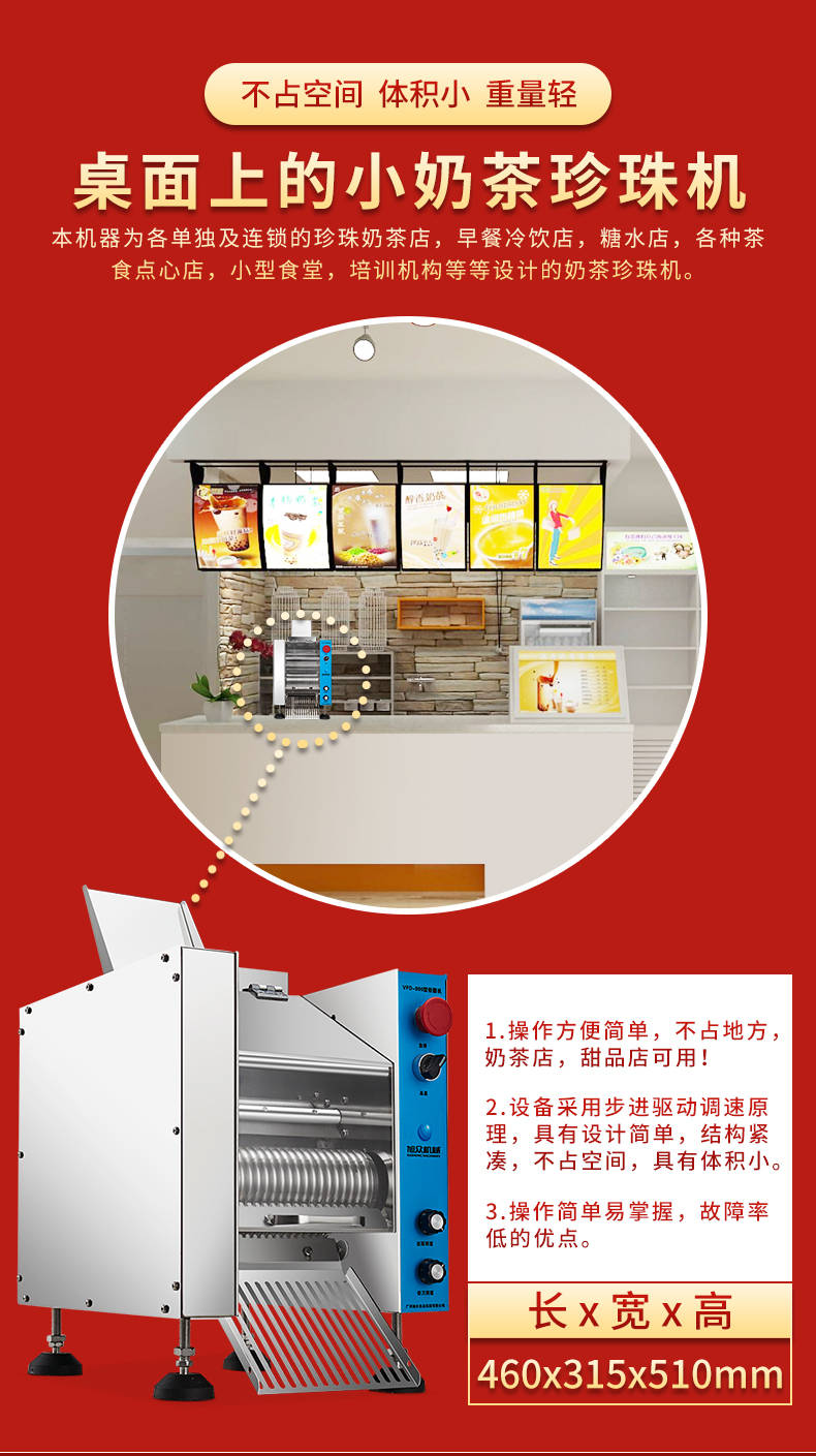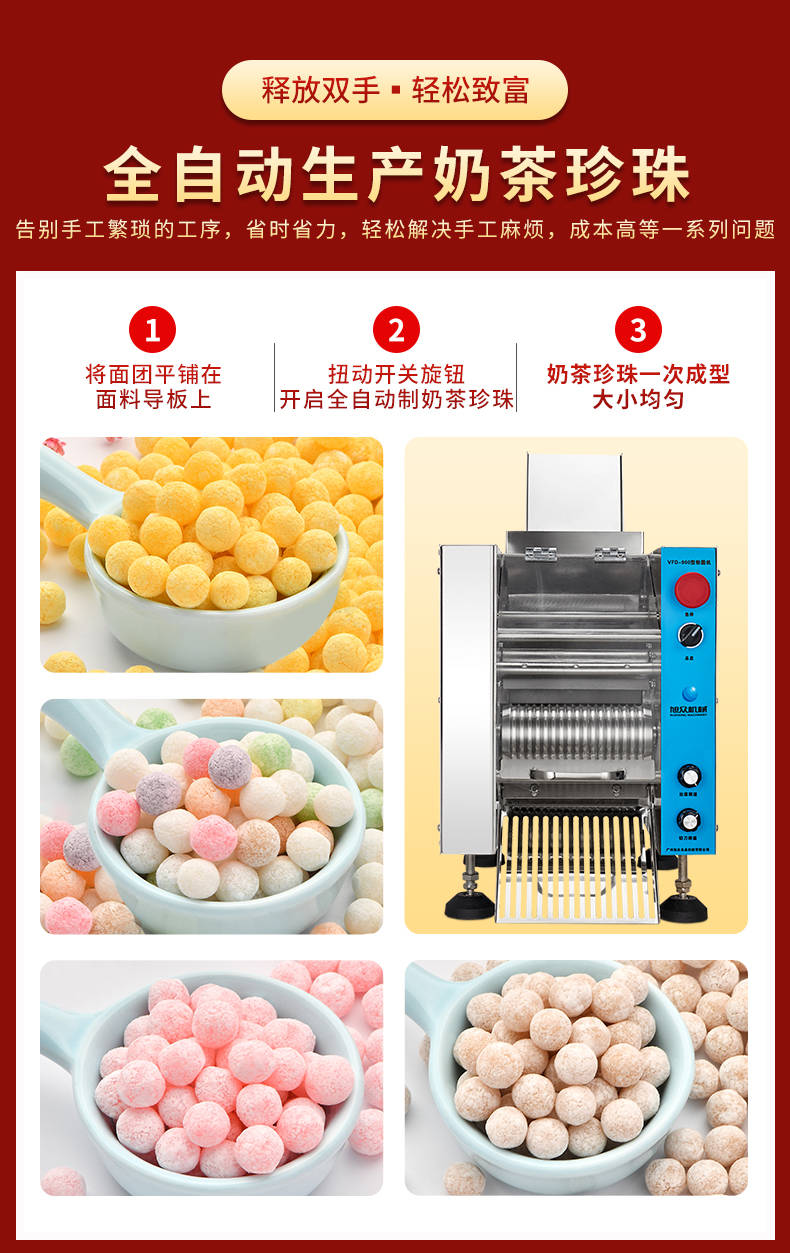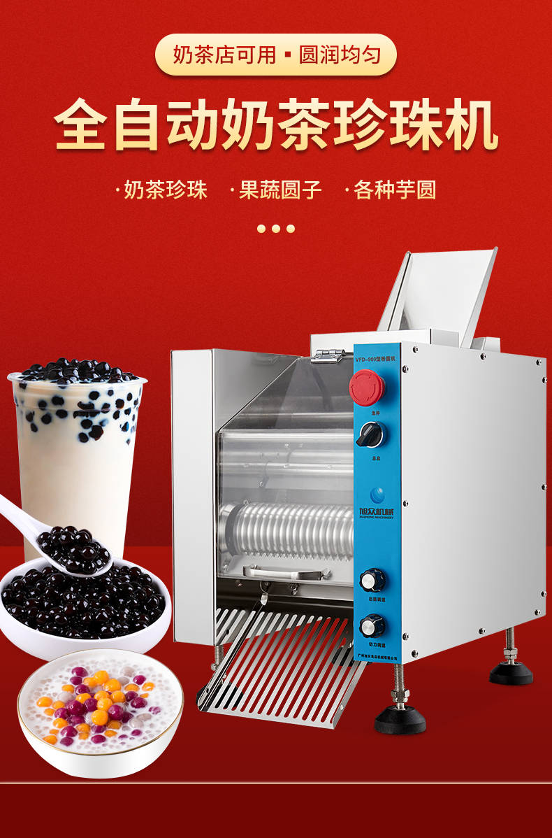 VFD-900珍珠奶茶機,奶茶店、甜品店可用??缮a(chǎn)奶茶珍珠,果蔬圓子,無餡湯圓,水晶湯圓,各種芋圓。不占空間、體積小、重量輕,桌面上的小奶茶珍珠機。告別手工繁瑣的工序,省時省力,輕松解決手工麻煩,成本高等一系列問題