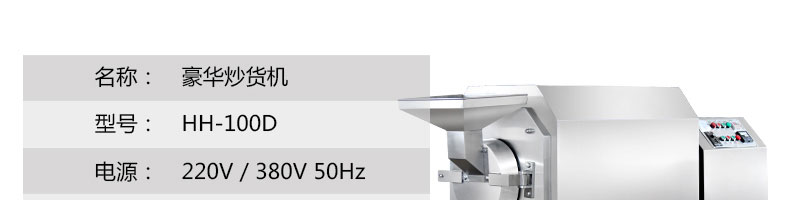 名稱豪華型100D炒貨機 電源220/380V(見機器銘牌) 功率11kw 產量60-100斤/次 尺寸1650*730*1250mm 重量90kg 規(guī)格 其他