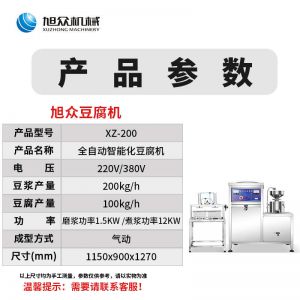 名稱XZ-300型氣動壓榨豆腐機(jī) 電源220/380V 功率磨漿功率1.5KW,煮漿功率24KW,總功率25.65KW 產(chǎn)量豆?jié){產(chǎn)量300kg/h,豆腐產(chǎn)量150kg/h 尺寸1750X850X1300mm 重量聯(lián)系銷售員 規(guī)格聯(lián)系銷售員 其他成型方式:氣動