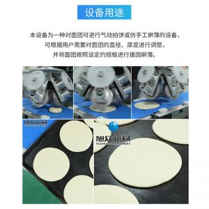 XZ-150型搟薄機(jī),為一種對(duì)面團(tuán)可進(jìn)行氣動(dòng)拍餅或仿手工搟薄的設(shè)備,可根據(jù)用戶需要對(duì)面團(tuán)的直徑、厚度進(jìn)行調(diào)整并將面團(tuán)按照設(shè)定的規(guī)格進(jìn)行搓圓摔搟薄。