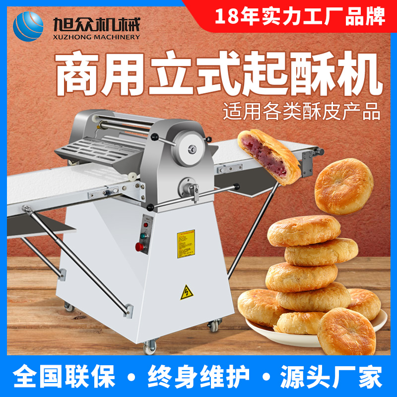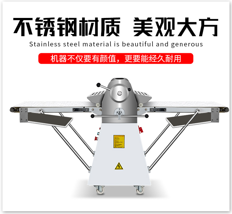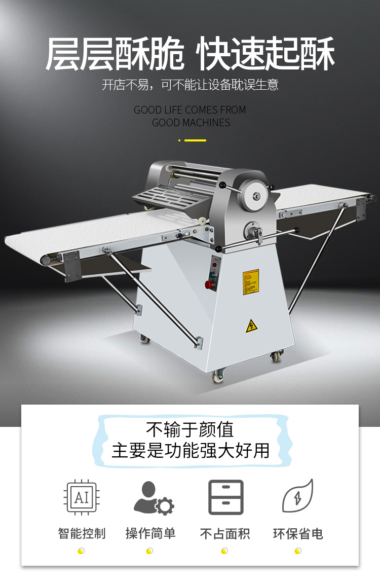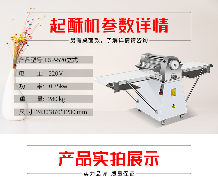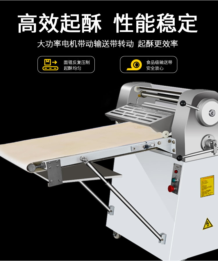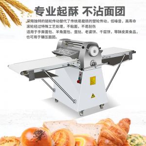 LSP-520酥皮機(jī),采用獨(dú)特的鏈輪傳動替代了傳統(tǒng)易磨損的塑輪傳動,低噪音,高壽命滾輪經(jīng)過特殊工藝處理,不粘面,不易刮傷適用于手撕面包、羊角面包、蛋撻、老婆餅、千層餅,等酥皮類食品,也可用于輾壓面團(tuán)。