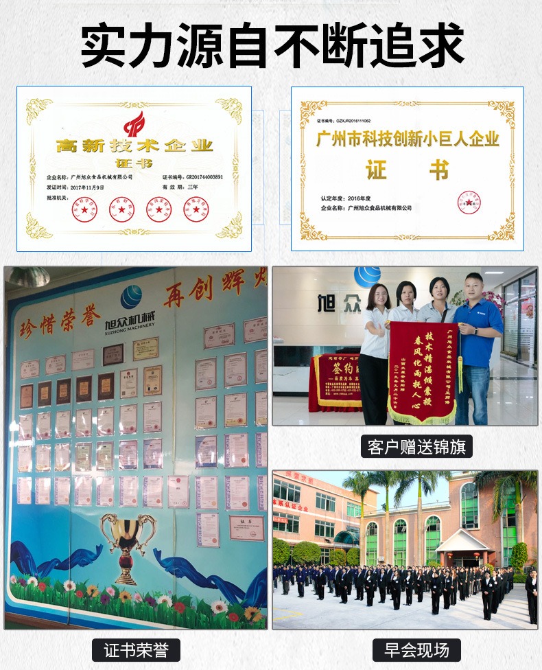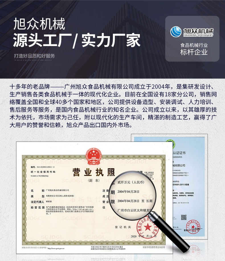 廣州旭眾食品機(jī)械有限公司是一家集科研開發(fā),生產(chǎn)設(shè)計(jì),營(yíng)銷服務(wù)為一體的現(xiàn)代化生產(chǎn)企業(yè)?,F(xiàn)代化生產(chǎn)車間,精湛制造技術(shù),所產(chǎn)機(jī)械歷經(jīng)市場(chǎng)重重考驗(yàn),不斷贏得海內(nèi)外客戶的贊譽(yù)。