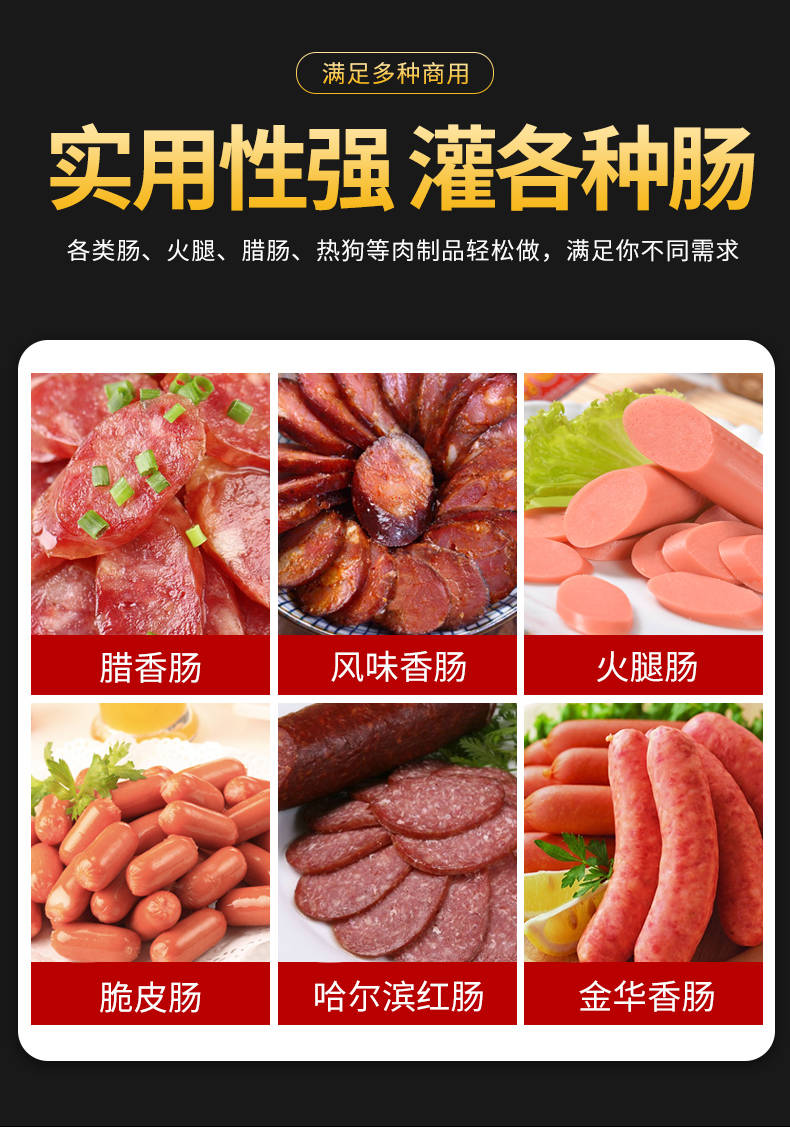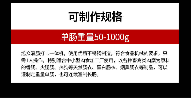 XZ-I型自動(dòng)定量灌腸機(jī),使用優(yōu)質(zhì)不銹鋼制造,符合食品機(jī)械的要求,只需1人操作,特別適合中小型肉食加工廠使用,以各種畜禽類肉糜為原料的香腸、火腿腸、熱狗等天然腸衣、蛋白腸衣、煙熏腸衣等制品,可以灌制定重量單腸,也可連續(xù)灌制長腸。