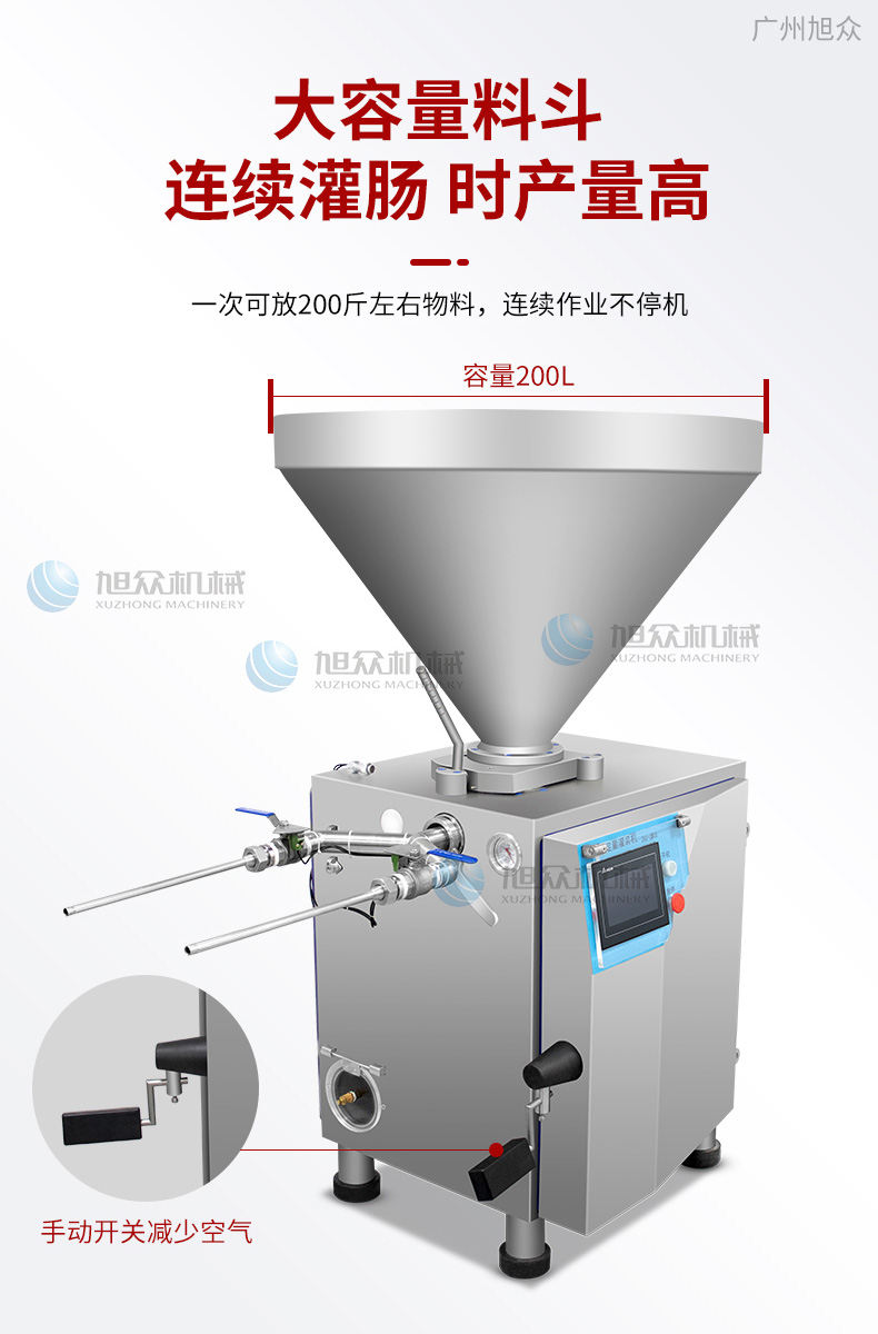 XZ-ZKG2800真空灌腸機(jī),真空葉片灌裝機(jī)連續(xù)作業(yè)加料后不需停機(jī),可灌肉粒&肉糜實(shí)用性強(qiáng)灌各種腸可做烤腸、親親腸、廣式臘腸、火鍋腸等連續(xù)灌制長(zhǎng)腸。