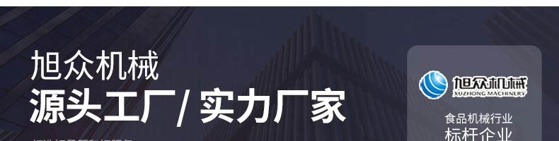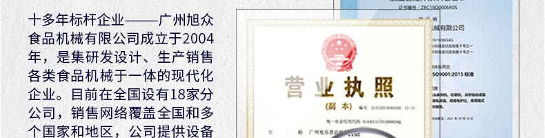 廣州旭眾食品機械有限公司是一家集科研開發(fā),生產設計,營銷服務為一體的現(xiàn)代化生產企業(yè)?,F(xiàn)代化生產車間,精湛制造技術,所產機械歷經市場重重考驗,不斷贏得海內外客戶的贊譽。