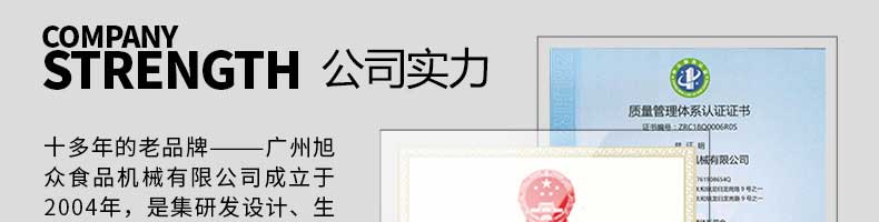 廣州旭眾食品機(jī)械有限公司是一家集科研開(kāi)發(fā),生產(chǎn)設(shè)計(jì),營(yíng)銷服務(wù)為一體的現(xiàn)代化生產(chǎn)企業(yè)?,F(xiàn)代化生產(chǎn)車間,精湛制造技術(shù),所產(chǎn)機(jī)械歷經(jīng)市場(chǎng)重重考驗(yàn),不斷贏得海內(nèi)外客戶的贊譽(yù)。