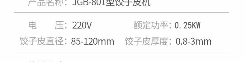 名稱801餃子皮機(jī) 電源220V 功率0.25KW 產(chǎn)量 尺寸650*380*750MM 重量 規(guī)格 其他