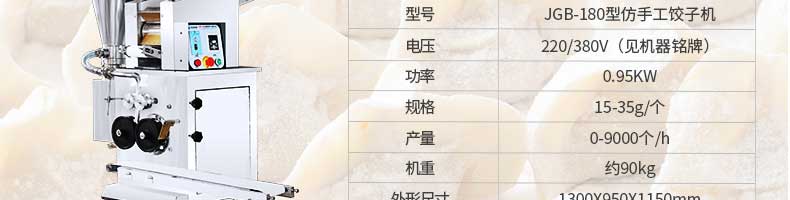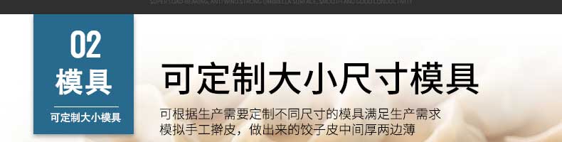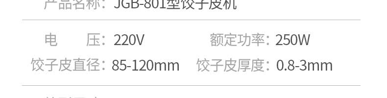 名稱801II餃子皮機 電源220V 功率250W 產(chǎn)量各款有不同,聯(lián)系銷售員 尺寸650X380X750mm 重量各款有不同,聯(lián)系銷售員 規(guī)格餃子皮直徑:85-120mm餃子皮厚度:0.8-3mm 其他