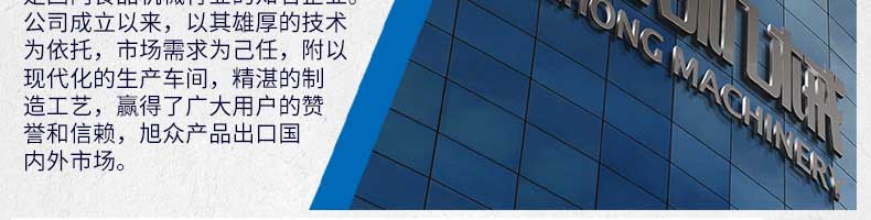 廣州旭眾食品機械有限公司是一家集科研開發(fā),生產(chǎn)設(shè)計,營銷服務(wù)為一體的現(xiàn)代化生產(chǎn)企業(yè)?,F(xiàn)代化生產(chǎn)車間,精湛制造技術(shù),所產(chǎn)機械歷經(jīng)市場重重考驗,不斷贏得海內(nèi)外客戶的贊譽。