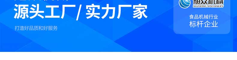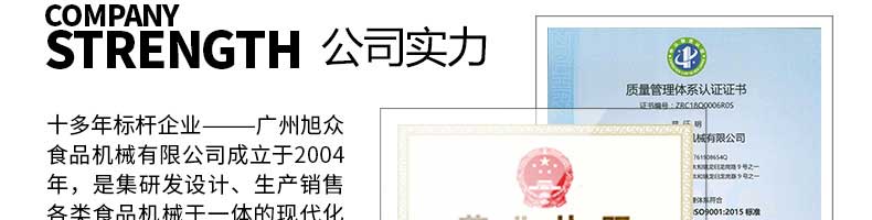 廣州旭眾食品機(jī)械有限公司是一家集科研開發(fā),生產(chǎn)設(shè)計(jì),營銷服務(wù)為一體的現(xiàn)代化生產(chǎn)企業(yè)?,F(xiàn)代化生產(chǎn)車間,精湛制造技術(shù),所產(chǎn)機(jī)械歷經(jīng)市場(chǎng)重重考驗(yàn),不斷贏得海內(nèi)外客戶的贊譽(yù)。