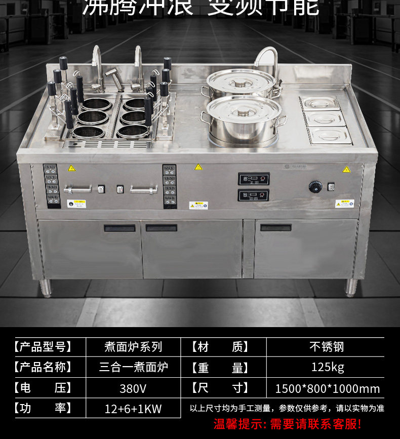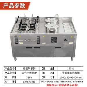 名稱三合一煮面爐 電源380V 功率12+6+1KW 產(chǎn)量請咨詢銷售員 尺寸1500*800*1000mm 重量125kg 規(guī)格請咨詢銷售員 其他不銹鋼材質(zhì)