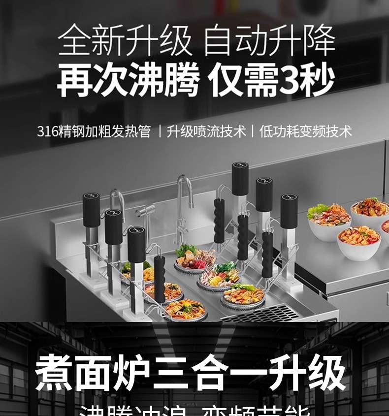 三合一煮面爐,全新升級,自動(dòng)升降再次沸騰,僅需3秒。316精鋼加粗發(fā)熱管、升級噴流技術(shù)、低功耗變頻技術(shù)。煮面爐三合一升級,沸騰沖浪、變頻節(jié)能。