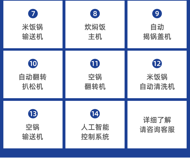 名稱機(jī)械手全自動米飯生產(chǎn)線 電源 380V 功率13KW 產(chǎn)量各型號不一,請咨詢銷售員 尺寸各型號不一,請咨詢銷售員 重量各型號不一,請咨詢銷售員 規(guī)格各型號不一,請咨詢銷售員 其他