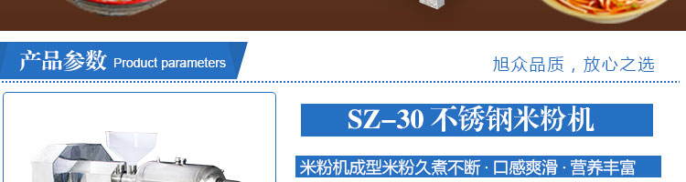 SZ-30不銹鋼米粉機(jī),可生產(chǎn)米粉、米線、桂林米粉、過(guò)橋米線、年糕、糍粑等產(chǎn)品。各種形狀都可生產(chǎn)(圓、扁),加工食品外表光滑,厚薄、寬窄、粗細(xì)均勻可調(diào),筋軟適度,有彈性,口感柔軟、味道純正。
