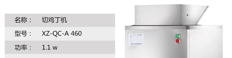 XZ-QC-A460切丁機,切雞丁機適合將帶軟骨的禽類,如雞、鴨、鵝、鴿、魚類等切成塊(?。?。本系列設(shè)備工作效率高,采用不銹鋼制作,美觀耐用,切割快速,少碎骨。