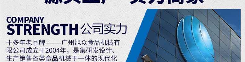 廣州旭眾食品機(jī)械有限公司是一家集科研開發(fā),生產(chǎn)設(shè)計,營銷服務(wù)為一體的現(xiàn)代化生產(chǎn)企業(yè)。現(xiàn)代化生產(chǎn)車間,精湛制造技術(shù),所產(chǎn)機(jī)械歷經(jīng)市場重重考驗(yàn),不斷贏得海內(nèi)外客戶的贊譽(yù)。