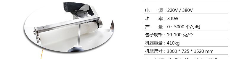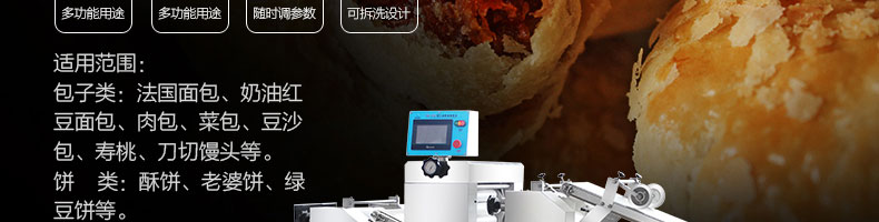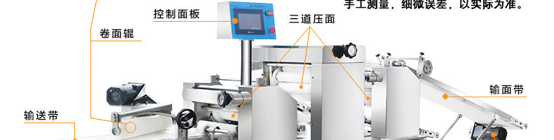 名稱(chēng)xz-15c三道搟面酥餅機(jī) 電源220/380V(見(jiàn)機(jī)器名牌) 功率3kw 產(chǎn)量0-5000個(gè)/小時(shí) 尺寸主機(jī)尺寸3300*725*1520mm,成型機(jī)尺寸1550*800*820mm,出餡機(jī)尺寸870*4 重量410+110+170kg 規(guī)格10-150克/個(gè) 其他