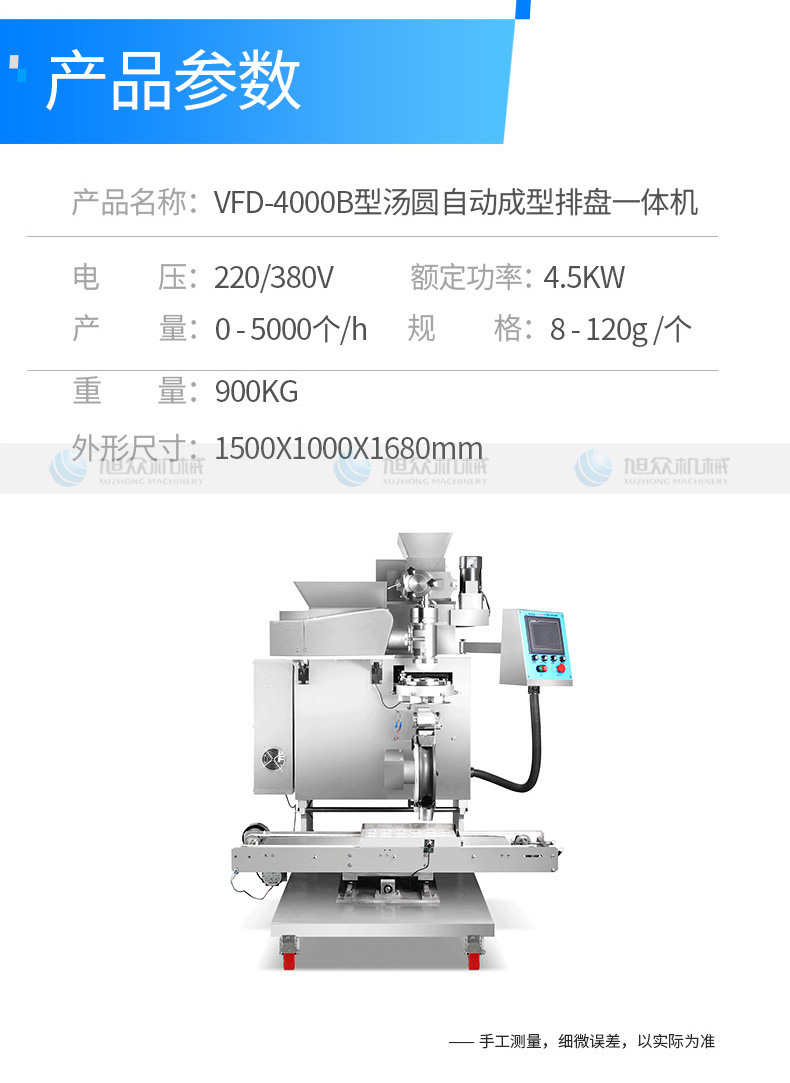 名稱VFD-4000B湯丸機(jī) 電源220/380V 功率4.5KW 產(chǎn)量0-5000個(gè)/h 尺寸1500X10001680mm 重量900KG 規(guī)格8-120g/ 其他