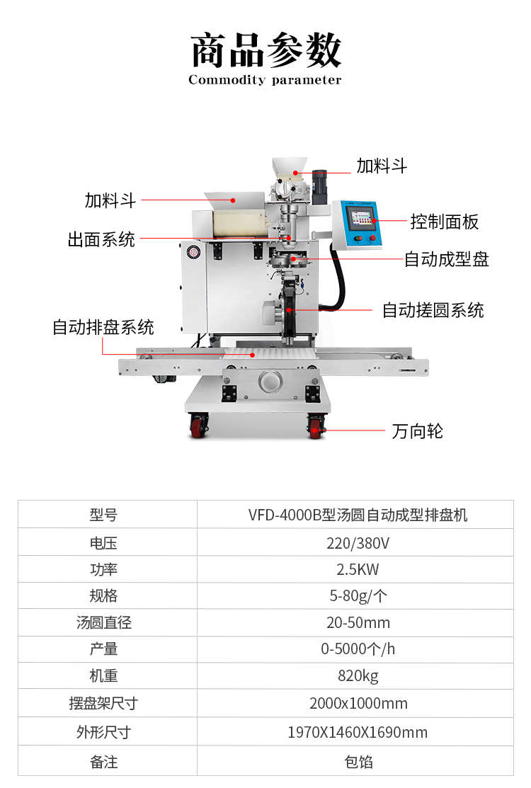 名稱VFD-4000B湯圓機 電源220/380V 功率2.5KW 產(chǎn)量0-5000個/h 尺寸1970X1460X1690mm 重量820kg 規(guī)格5-80g/個(湯圓直徑:20-50mm) 其他包餡