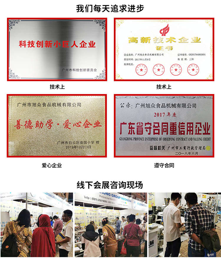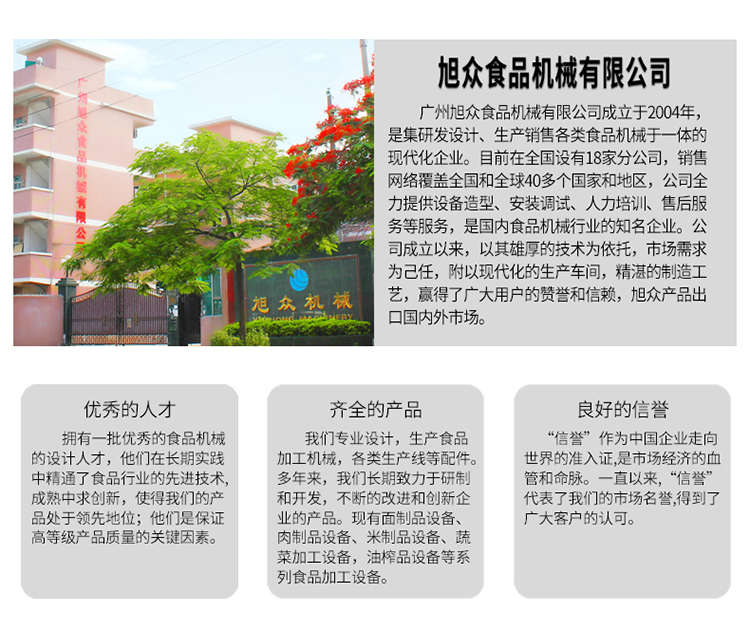 廣州旭眾食品機械有限公司是一家集科研開發(fā),生產(chǎn)設(shè)計,營銷服務(wù)為一體的現(xiàn)代化生產(chǎn)企業(yè)?,F(xiàn)代化生產(chǎn)車間,精湛制造技術(shù),所產(chǎn)機械歷經(jīng)市場重重考驗,不斷贏得海內(nèi)外客戶的贊譽。