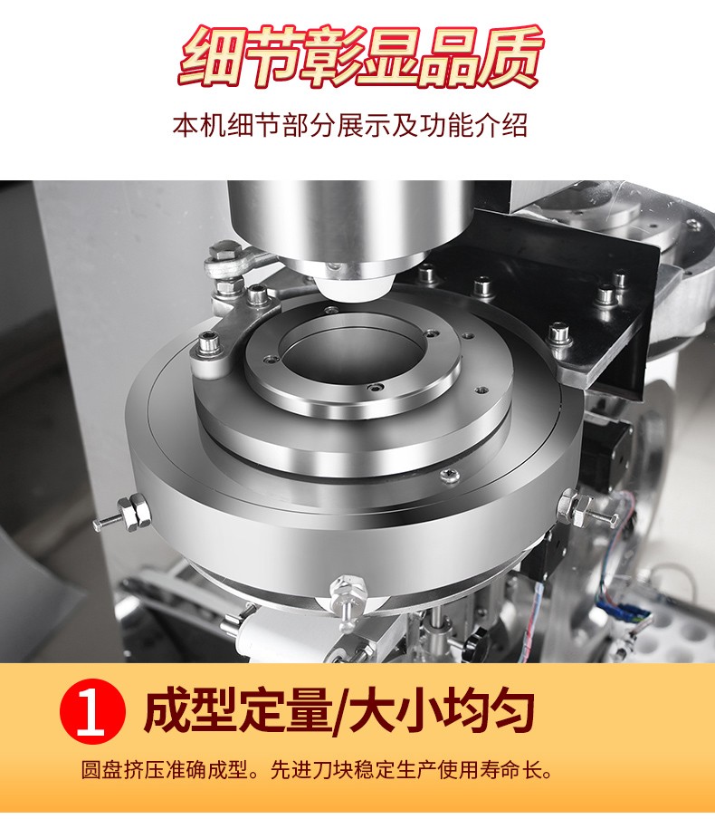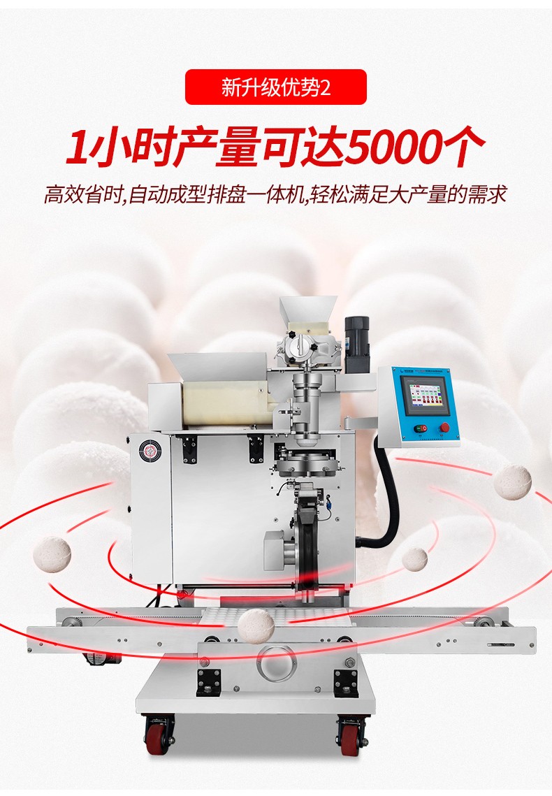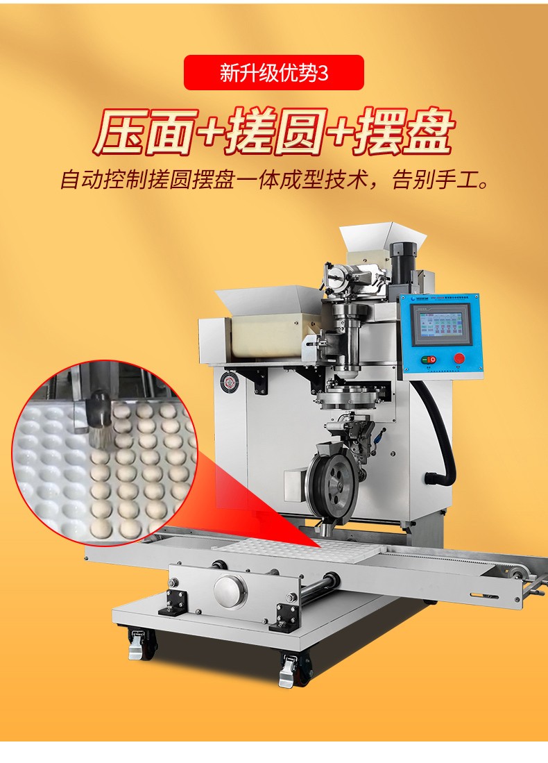 ◆觸摸屏自動控制搓圓擺盤一體成型技術(shù),使得制品外形美觀,大小均勻,表面光亮細膩、口感柔滑,彈韌性佳。