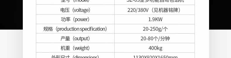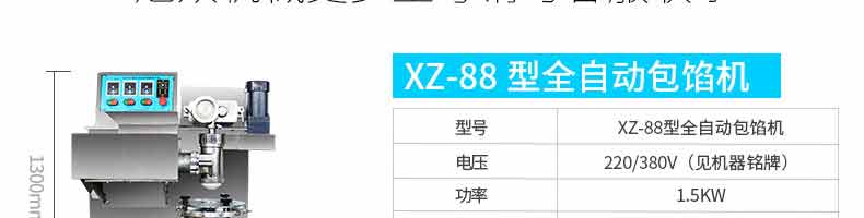 名稱XZ-65多功能包餡機 電源220/380V 功率1.9kw 產(chǎn)量20-80個/分鐘 尺寸1130*920*1650mm 重量400kg 規(guī)格20-250克/個 其他皮餡比例2:8 5:5