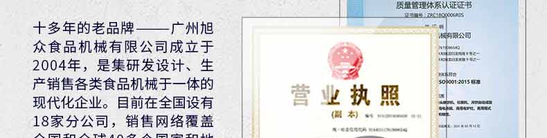 廣州旭眾食品機械有限公司是一家集科研開發(fā),生產(chǎn)設(shè)計,營銷服務為一體的現(xiàn)代化生產(chǎn)企業(yè)?,F(xiàn)代化生產(chǎn)車間,精湛制造技術(shù),所產(chǎn)機械歷經(jīng)市場重重考驗,不斷贏得海內(nèi)外客戶的贊譽。