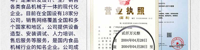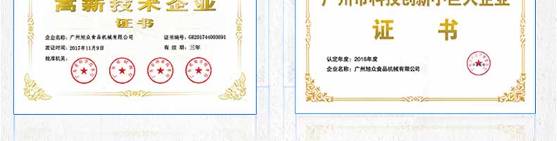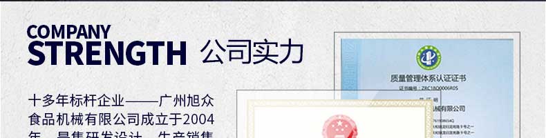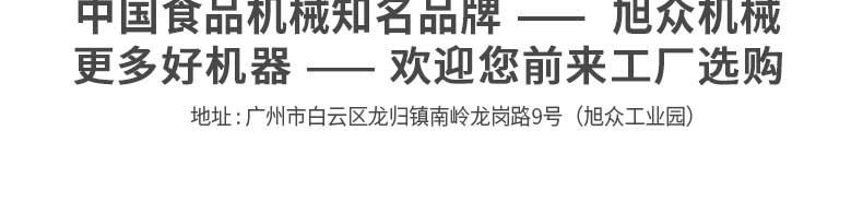 廣州旭眾食品機(jī)械有限公司是一家集科研開發(fā),生產(chǎn)設(shè)計(jì),營銷服務(wù)為一體的現(xiàn)代化生產(chǎn)企業(yè)?,F(xiàn)代化生產(chǎn)車間,精湛制造技術(shù),所產(chǎn)機(jī)械歷經(jīng)市場(chǎng)重重考驗(yàn),不斷贏得海內(nèi)外客戶的贊譽(yù)。